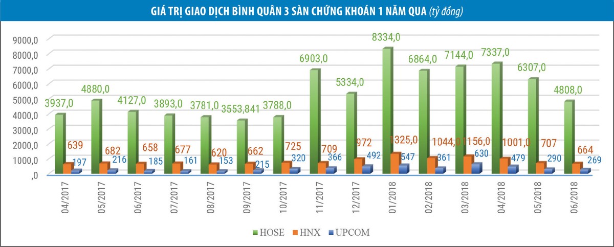 Thống kê cho thấy, nếu như trong quý I/2018, khối lượng giao dịch bình quân của VN-Index lên đến 255,4 triệu đơn vị/phiên, tương ứng giá trị 7.409,6 tỷ đồng/phiên, thậm chí có phiên giá trị giao dịch còn vượt mức 10.000 tỷ đồng, thì trong quý II/2018, khối lượng và giá trị giao dịch bình quân chỉ còn 183,9 triệu cổ phiếu/phiên, tương ứng giá trị 6.092,6 tỷ đồng/phiên, giảm lần lượt 28% và 17,8% so với quý 1/2018. Nếu loại trừ giao dịch thỏa thuận, giá trị khớp lệnh thực tế còn thấp hơn.