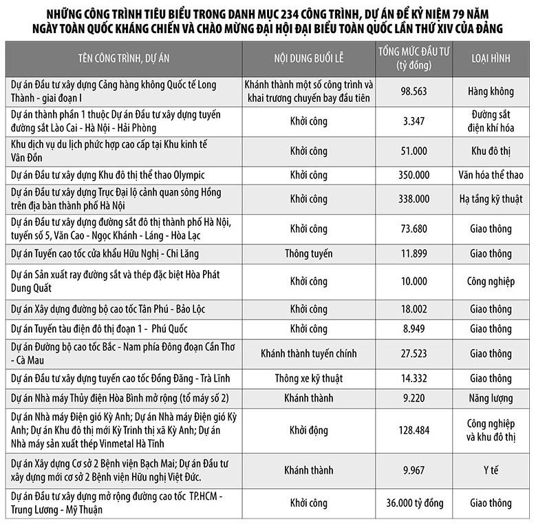 Trong đó, 86 công trình được khánh thành với tổng mức đầu tư hơn 378.000 tỷ đồng, nổi bật là việc hoàn thành thêm 440 km đường cao tốc, nối thông tuyến cao tốc Bắc - Nam từ Hữu Nghị tỉnh Lạng Sơn đến Đất Mũi tỉnh Cà Mau, nâng tổng chiều dài toàn quốc vượt mốc 3.000 km; cơ bản hoàn thành giai đoạn I, Cảng hàng không quốc tế Long Thành và đón chuyến bay kỹ thuật đầu tiên.