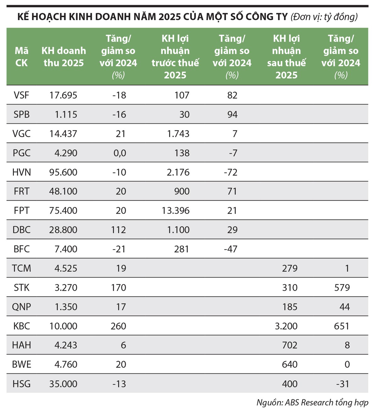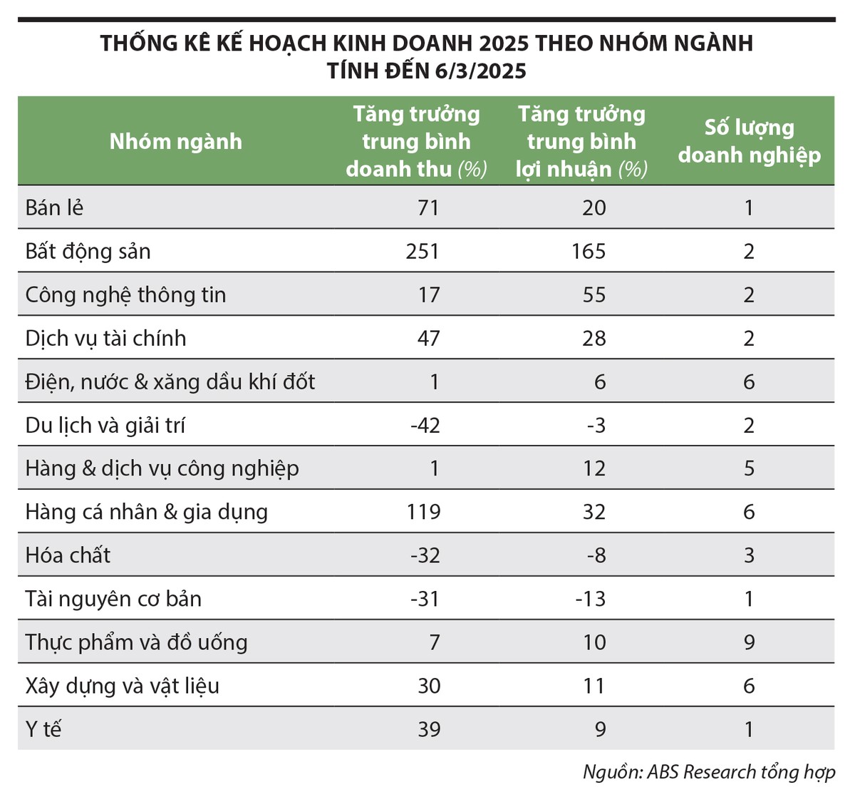 Theo dõi diễn biến gần đây, chúng tôi nhận thấy một loạt doanh nghiệp vốn hóa lớn đã đưa ra kế hoạch kinh doanh năm 2025 tăng trưởng khá cao so với năm 2024, trong đó phải kể đến là các doanh nghiệp công nghệ thông tin và dệt may, được hỗ trợ bởi yếu tố vĩ mô trong nước và quốc tế (xem bảng). Do đó, mùa đại hội cổ đông năm nay không chỉ có khả năng tạo ra những nhịp sóng ngắn hạn trên thị trường, mà còn có thể đặt nền móng cho xu hướng tăng trưởng dài hơn.