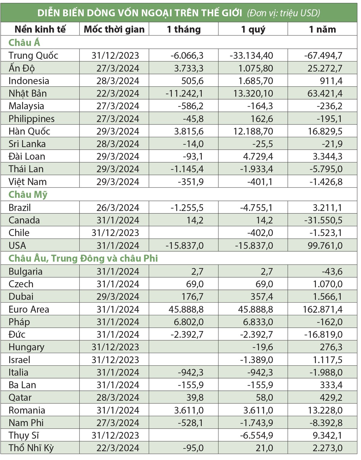 Trong bức tranh toàn cầu ngày càng biến động, dòng vốn có xu hướng dồn về các quốc gia được coi là an toàn hơn. Cụ thể, dòng vốn chảy rất mạnh vào Mỹ trong 12 tháng qua, trước khi bán ròng nhẹ gần đây. Khu vực châu Âu cũng hút tiền mạnh, nhưng dòng vốn có chọn lọc và bán ròng ở các nền kinh tế phục hồi chậm hơn mặt bằng chung như Pháp, Italia. Đối với khu vực châu Á, dòng tiền rút mạnh khỏi Trung Quốc, Thái Lan, Việt Nam và chảy vào Ấn Độ, Indonesia, Nhật Bản, Hàn Quốc, Đài Loan (Trung Quốc).