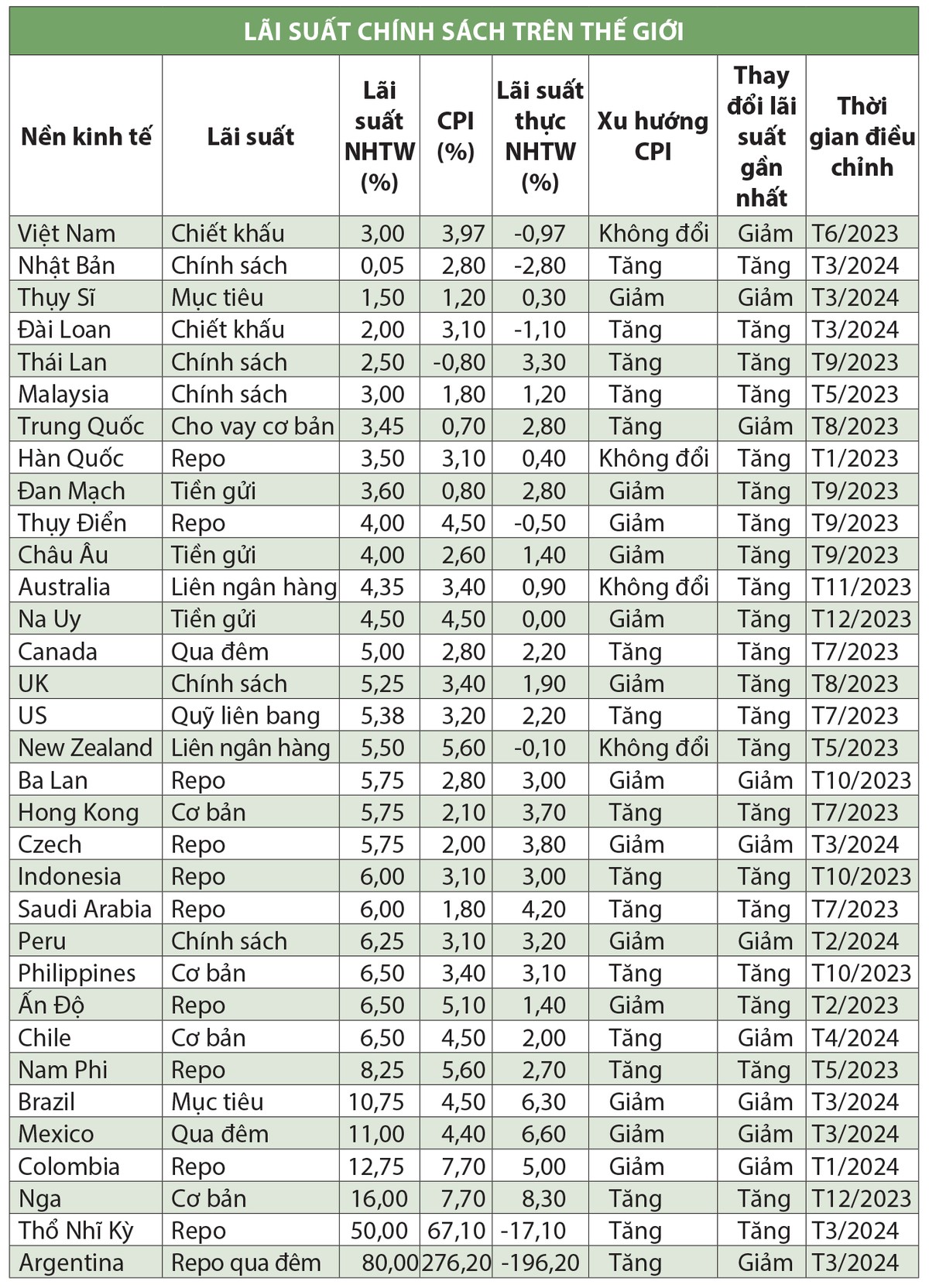 Nhìn vào xu hướng của chính sách tiền tệ, trên thế giới chỉ có Việt Nam và một số nước “đặc thù” như Trung Quốc, Thụy Sĩ, Ba Lan, Czech, Peru, Chile, Brazil, Mexico, Colombia và Argentina là đang tiến hành hạ lãi suất (theo quyết định gần nhất của ngân hàng trung ương). Hầu hết các quốc gia này có chính sách tiền tệ không ảnh hưởng quá lớn đến thế giới hoặc nền kinh tế đang gặp những vấn đề trầm trọng.