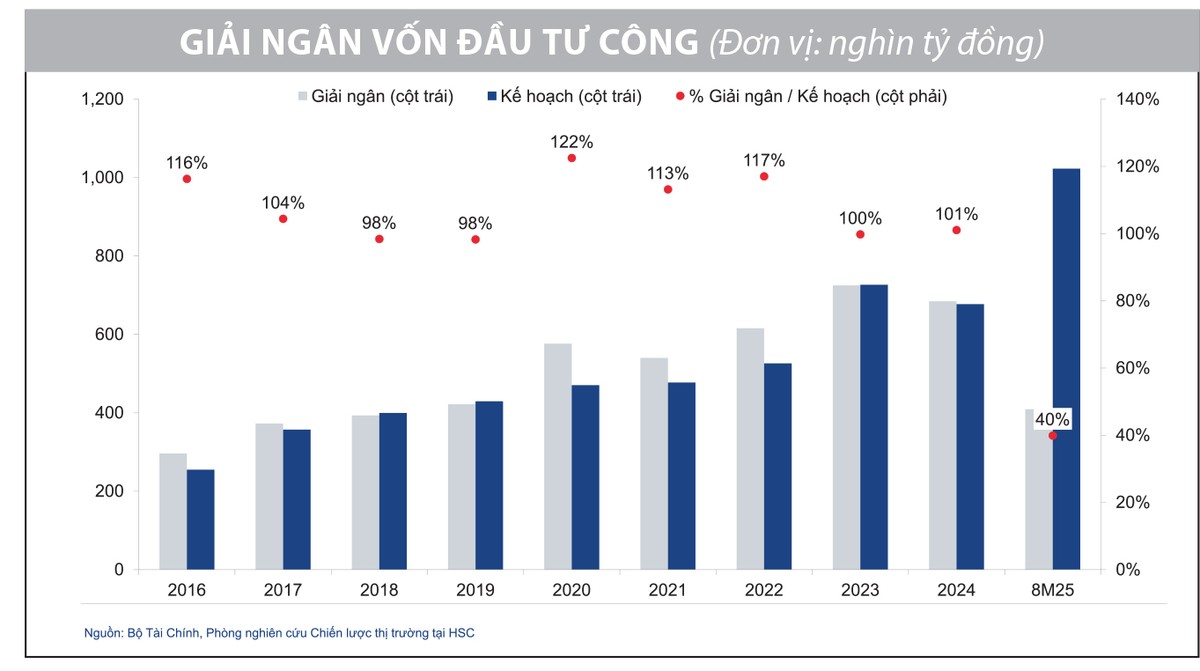 Chúng tôi kỳ vọng, đà giải ngân sẽ phục hồi mạnh trong quý IV, khi việc sắp xếp hành chính đã hoàn tất từ giữa tháng 9 và theo thông lệ nhiều năm, vốn đầu tư công thường tăng tốc vào cuối năm. Riêng quý IV có thể chứng kiến mức giải ngân vượt 440.000 tỷ đồng - một con số đủ để tạo lực đẩy lớn cho toàn nền kinh tế. Trong bối cảnh đó, giai đoạn hiện nay được xem là cơ hội thuận lợi để tích lũy cổ phiếu thuộc nhóm ngành hưởng lợi từ làn sóng đầu tư công sắp tới, khi thị trường đã bắt đầu phản ánh kỳ vọng về nhịp tăng tốc giải ngân vào cuối năm.