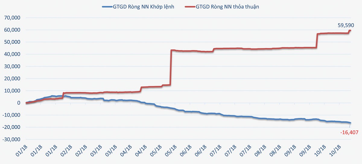 Giá trị giao dịch ròng lũy kế của nhà đầu tư nước ngoài (đơn vị: tỷ đồng).