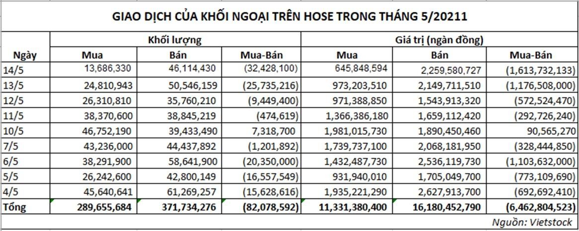 Bước sang tháng 5, cho tới nay các nhà đầu tư nước ngoài chỉ mua ròng duy nhất hôm 10/5 với giá trị rất nhỏ, hơn 90 tỷ đồng. Trong khi đó tổng khối lượng bán ròng của khối này hiện đã lên tới gần 6.500 tỷ đồng.