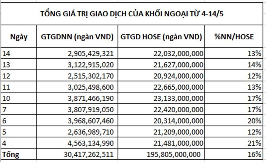 Tổng giá trị giao dịch trên HOSE kể từ đầu tháng cho tới ngày 14/5 đạt gần 196 ngàn tỷ đồng, trong khi đó khối ngoại đóng góp hơn 30.400 tỷ đồng, chiếm 16% giá trị giao dịch toàn thị trường.