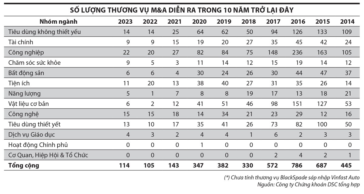 Trong danh sách các thương vụ M&A tiêu biểu năm 2023, ngoại trừ thương vụ Vinfast Auto hợp nhất với Black Spade Acquisition Co, có thể kể đến thương vụ Sumitomo chi khoảng 1,5 tỷ USD mua 15% cổ phần VPBank, AEON chi 4.300 tỷ đồng mua 100% vốn góp tại Công ty Tài chính TNHH MTV Bưu điện (PTF) từ SeABank, ESR bỏ ra 450 triệu USD mua cổ phần BW Industrial…