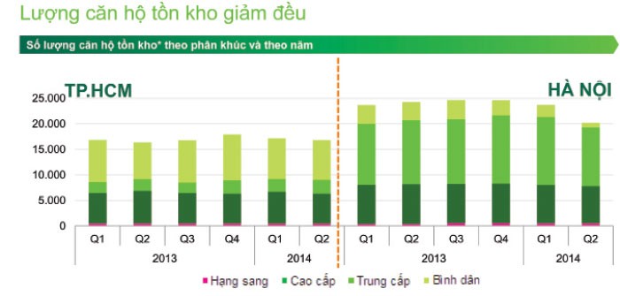 | Sự phục hồi của thị trường bất động sản dưới góc nhìn của Bộ Xây dựng Tổng hợp của Bộ Xây dựng cho thấy, sau 11 tháng đầu năm 2014, tồn kho bất động sản đã giảm mạnh. Cụ thể, đến ngày 20/11/014, tồn kho cả nước ước còn 77.800 tỷ đồng, giảm gần 40% so với quý I/2013 và giảm 17% so với cuối năm 2013. Trong đó, tồn kho căn hộ chung cư là 15.775 căn, nhà thấp tầng 13.000 căn, đất nền nhà ở là 8,6 triệu m2, đất nền thương mại là 1,6 triệu m2. Hà Nội còn tồn 1.911 căn hộ chung cư và 2.582 căn nhà thấp tầng. TP.HCM còn tồn 6.600 căn hộ chung cư, 716 căn nhà thấp tầng và 264.000 m2 đất nền nhà ở. |