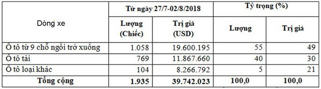 Thông tin sơ bộ lượng xe đăng ký nhập khẩu từ ngày 27/7/2018 đến ngày 2/8/2018 như sau: