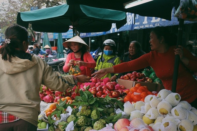 Hàng rau củ quả cũng rực rỡ sắc màu bởi tập hợp đủ loại trái cây để phục vụ bày mâm ngũ quả, cũng như để nấu những món ăn ngày Tết.