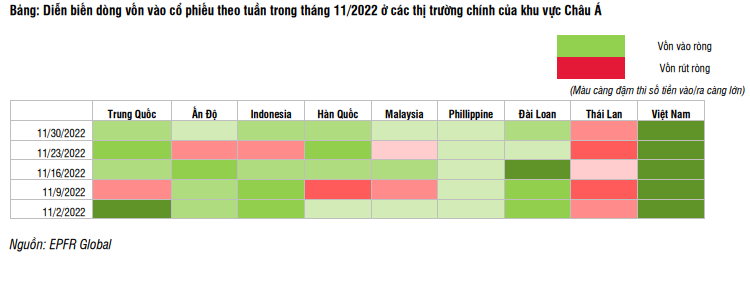 Ở chiều ngược lại, dòng vốn vào cổ phiếu thị trường mới nổi cải thiện, vào ròng 9,9 tỷ USD, tập trung lớn ở khu vực Châu Á. Đồng USD yếu đi giúp dòng vốn chuyển hướng vào thị trường mới nổi, trong khi đó câu chuyện về việc Trung Quốc sẽ nới lỏng chính sách Covid-19 giúp dòng tiền đẩy mạnh các quốc gia trong khu vực Châu Á như Việt Nam, Ấn Độ, Hàn Quốc, Đài Loan. Yếu tố này đã giúp thị trường chứng khoán Châu Á trong tháng 11 có mức tăng vượt trội, khi chỉ số MSCI Châu Á (trừ Nhật Bản) tăng tới 18,8%, so với mức khiêm tốn 5,6% của S&P500.