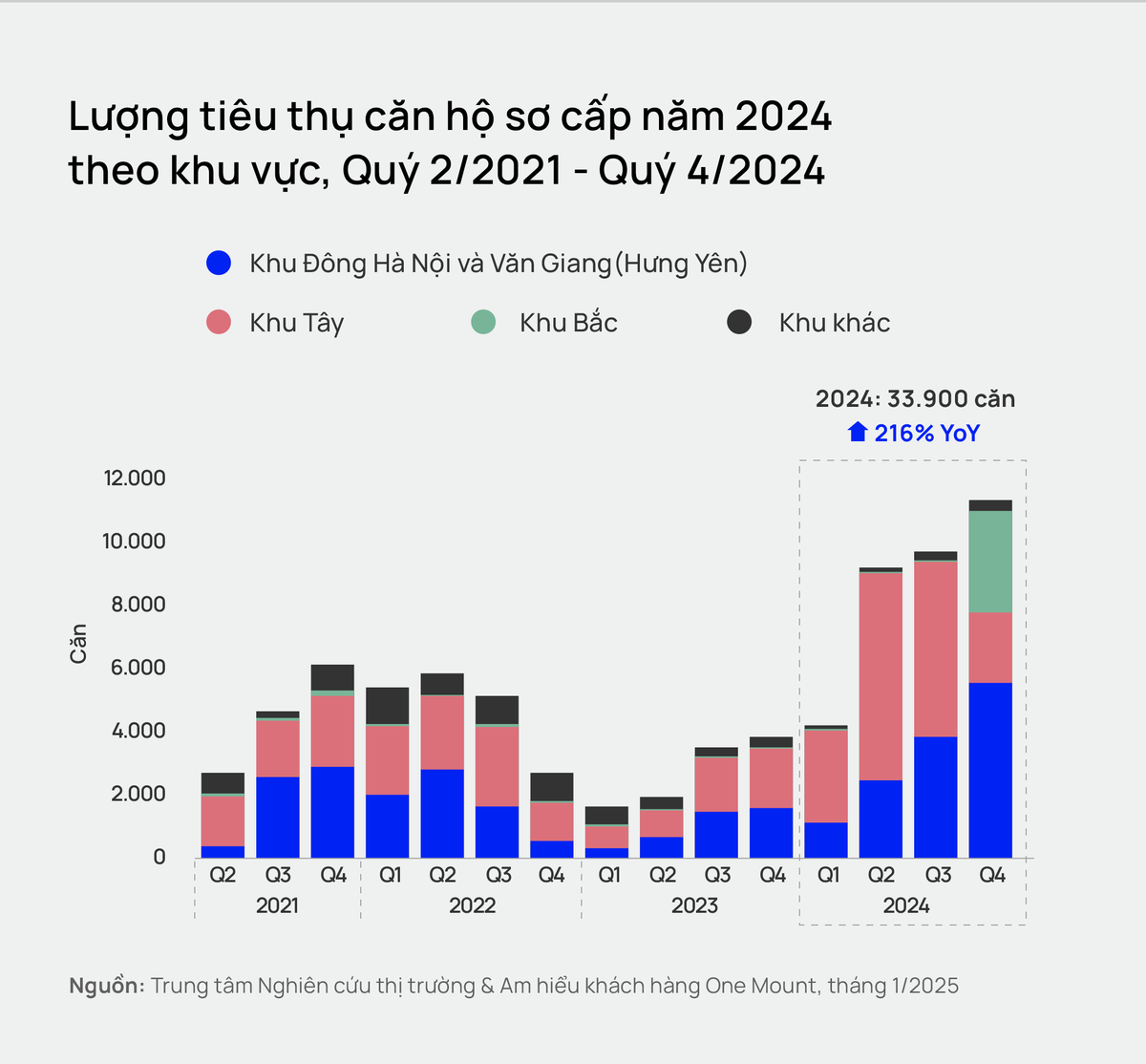 Theo One Mount, trong quý IV/2024, lượng tiêu thụ khu Đông Hà Nội và Văn Giang (Hưng Yên) đạt khoảng 5.500 căn, nhờ việc ra mắt liên tục nhiều dự án mới tại Vinhomes Ocean Park 1. Các dự án này thu hút được người mua nhờ được quy hoạch bài bản, đầy đủ tiện ích sống cao cấp và có đơn giá (khoảng 68,9 triệu đồng/m2) thấp hơn đáng kể so với trung bình toàn thị trường (khoảng 76,7 triệu đồng/m2).
