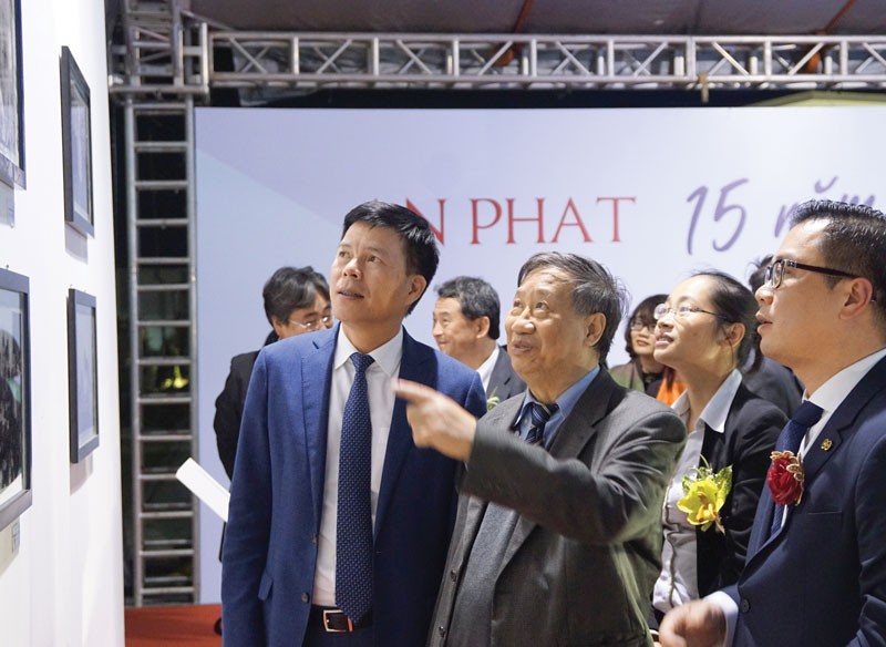 Dẫn nguyên Phó thủ tướng Chính phủ Phạm Gia Khiêm đi qua nhiều không gian vào Hội trường lớn dự Lễ kỷ niệm, Chủ tịch AAA Phạm Ánh Dương giới thiệu những tấm ảnh cũ cùng chiếc máy cắt C36 - một trong những máy sản xuất đầu tiên của An Phát.