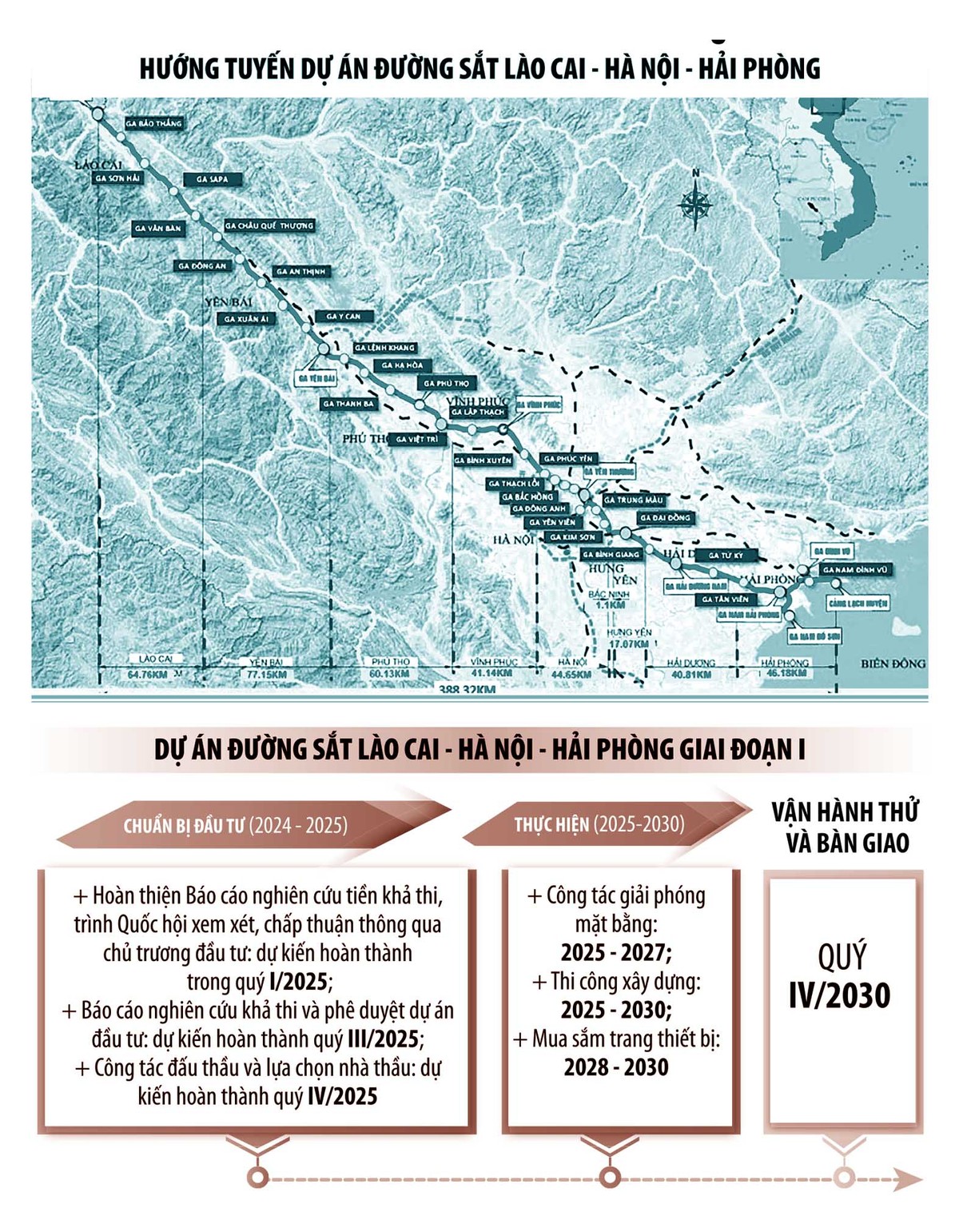 Trước đó, tại Thông báo số 575/TB-VPCP, Thủ tướng Chính phủ Phạm Minh Chính yêu cầu Bộ GTVT báo cáo Chính phủ, cấp có thẩm quyền cho chủ trương đầu tư tuyến đường sắt Lào Cai - Hà Nội - Hải Phòng trong tháng 1/2025; trình Quốc hội phê duyệt tại Kỳ họp Quốc hội trong tháng 2/2025; bảo đảm hoàn thành các quy trình, thủ tục, công việc cần thiết để khởi công toàn tuyến trước ngày 10/12/2025.