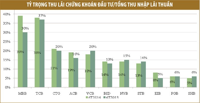 Bên cạnh đó, việc mở rộng danh mục nhanh chóng khiến phần thu nhập lãi chứng khoán đầu tư (chủ yếu là TPCP) đóng góp tỷ trọng lớn hơn vào tổng thu nhập lãi thuần của các ngân hàng trong 6 tháng đầu năm 2014. Mức tăng đáng kể nhất có thể thấy ở MBB, ngoài tốc độ mở rộng danh mục, một yếu tố nữa giúp MBB thu lãi lớn từ chứng khoán đầu tư đó là ngân hàng chú trọng hơn vào trái phiếu được Chính phủ bảo lãnh, các trái phiếu này có lợi tức cao hơn so với TPCP.