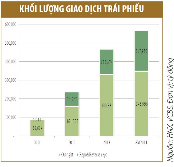 8 tháng đầu năm 2014, khối lượng giao dịch outright đã vượt cả năm ngoái, đạt gần 350.000 tỷ đồng. Khối lượng giao dịch repo cũng không ngừng gia tăng và ngày càng chiếm tỷ lệ cao. Việc sử dụng hình thức repo làm đòn bẩy tài chính là khá phổ biến trong thời gian qua.
