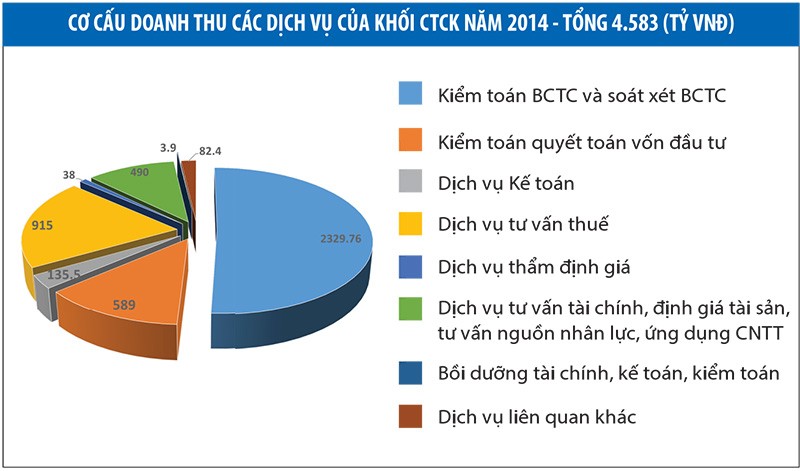 Số liệu cập nhật nhất của tổ chức nghề nghiệp kiểm toán cũng cho biết, năm 2014, tổng doanh thu toàn thị trường đạt 4.583 tỷ đồng; trong đó, mảng dịch vụ chính yếu của khối công ty kiểm toán là dịch vụ kiểm toán và soát xét báo cáo tài chính là 2.329,76 tỷ đồng, chiếm khoảng 50% cơ cấu doanh thu toàn ngành.
