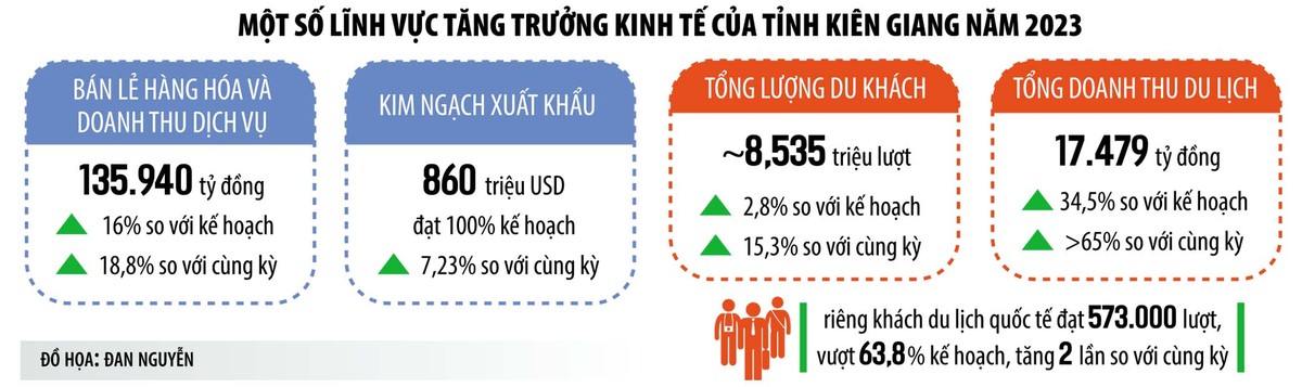 Theo Báo cáo của UBND tỉnh Kiên Giang, năm 2023, kinh tế tỉnh phục hồi và phát triển mạnh mẽ, tốc độ tăng tổng sản phẩm trên địa bàn ước đạt 106,79% so với cùng kỳ; hầu hết các ngành, lĩnh vực và hoạt động sản xuất, kinh doanh tiếp tục phát triển ổn định.