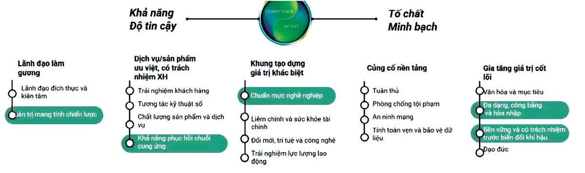 Trong nghiên cứu này, người ta cũng khảo sát ESG gắn với thị trường vốn tư nhân với hơn 1.000 quỹ đầu tư tham gia khảo sát. Các yếu tố được quan tâm thể hiện qua 5 trụ cột chính: Lãnh đạo làm gương; Dịch vụ sản phẩm ưu việt, có trách nhiệm xã hội; Khung tạo dựng giá trị khác biệt; Củng cố nền tảng; Gia tăng giá trị cốt lõi. Niềm tin phải gắn với năng lực để tạo 5 yếu tố này (xem biểu đồ).