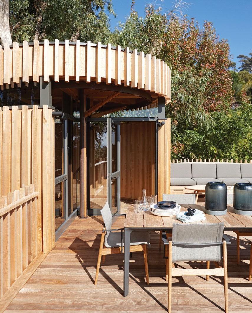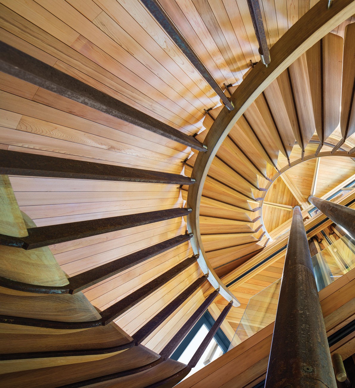 Cụ thể, ngôi nhà được xây dựng với cấu trúc vuông, nhưng tại mỗi góc được mở rộng với các hình vòng cung, vừa giúp tạo tầm nhìn thoáng đáng, vừa tạo độ mềm mại, tròn trịa như những gốc cổ thụ. Với vật liệu chính là các dầm thép và gỗ, ngôi nhà có độ chắc chắn nhưng vẫn nhẹ.