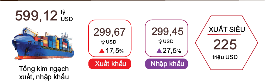 Tính chung 11 tháng, cán cân thương mại hàng hóa xuất siêu 225 triệu USD (cùng kỳ năm trước xuất siêu 20,19 tỷ USD). Trong đó, khu vực kinh tế trong nước nhập siêu 24,32 tỷ USD; khu vực có vốn đầu tư nước ngoài (kể cả dầu thô) xuất siêu 24,55 tỷ USD.