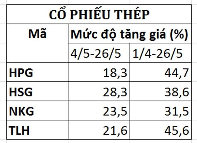 Đà tăng giá của thép trên thị trường quốc tế và trong nước cùng với sự thăng hoa của thị trường chứng khoán Việt Nam đã thúc đẩy đà tăng của các cổ phiếu ngành thép (bảng dưới).