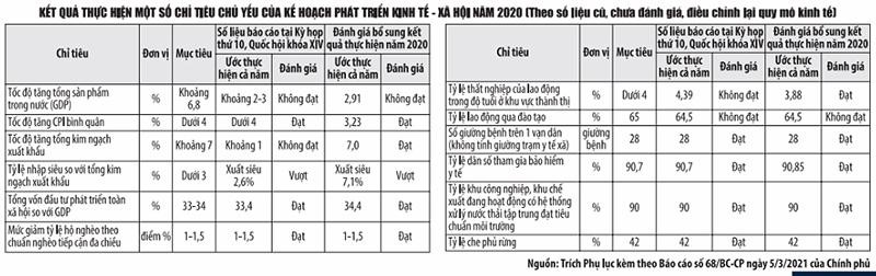 Về những thay đổi so với Báo cáo trình Quốc hội tại Kỳ họp thứ 10, Chính phủ khẳng định đã thực hiện tốt hơn các chỉ tiêu chủ yếu của năm 2020 được Quốc hội giao, kết quả đạt và vượt 10/12 chỉ tiêu chủ yếu. Trong đó, có thêm 2 chỉ tiêu đạt và vượt mục tiêu là: tốc độ tăng tổng kim ngạch xuất khẩu đạt 7% (số đã báo cáo là khoảng 1%); tỷ lệ thất nghiệp của lao động trong độ tuổi ở khu vực thành thị là 3,88% (số đã báo cáo là 4,39%).