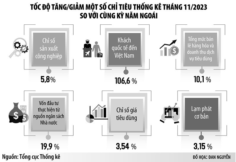 Những dấu cộng (+) trước các chỉ số kinh tế vĩ mô tháng 11/2023, biểu thị sự tăng trưởng so với tháng trước hoặc cùng kỳ năm trước, đã góp phần quan trọng tô thêm gam màu sáng cho bức tranh kinh tế năm 2023, vốn bộn bề khó khăn. Xu hướng phục hồi của nền kinh tế trở nên rõ ràng hơn.