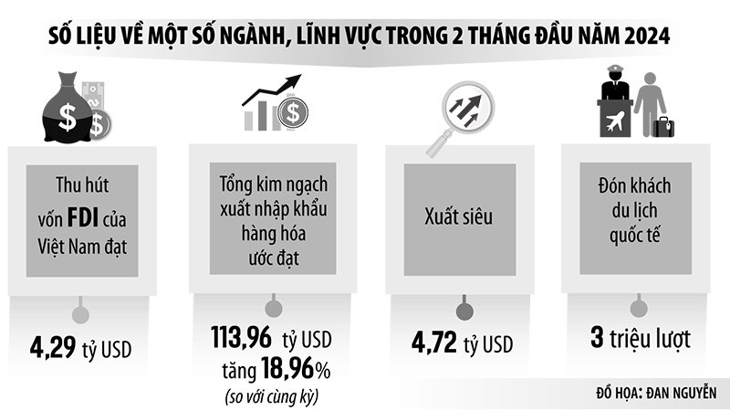 Theo đó, kết quả sản xuất, xuất khẩu, thu hút vốn đầu tư trực tiếp nước ngoài (FDI) trong 2 tháng đầu năm ghi nhận các chỉ dấu hồi phục khá tích cực, dù thời gian này có nhiều ngày nghỉ Tết Nguyên đán kéo dài.