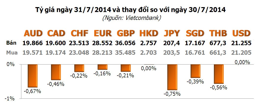 Các ngoại tệ khác đồng loạt giảm trong hai ngày qua, dẫn đầu là AUD với -1,01%; tiếp đến là JPY với -0,75%; CAD với -0,67%; THB với -0,56%...