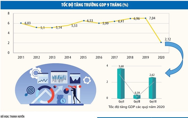 Quý I, GDP tăng trưởng 3,68% - tuy thấp, nhưng vẫn là “khá” trong bối cảnh Covid-19. Quý II, nền kinh tế “lao dốc”, với tốc độ tăng trưởng chỉ còn 0,39%. Sang quý III, dấu hiệu vượt dốc khá rõ ràng, khi từ “đáy” tăng trưởng thấp nhất của các quý II trong nhiều thập kỷ qua, tăng trưởng GDP đã đạt con số 2,62%, đưa con số tăng trưởng của 9 tháng lên 2,12%.