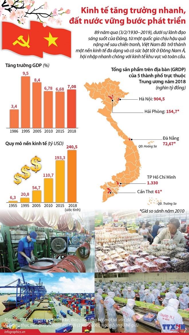 89 năm qua (3/2/1930-3/2/2019), dưới sự lãnh đạo sáng suốt của Đảng, từ một quốc gia chịu hậu quả nặng nề sau chiến tranh, Việt Nam đã thay đổi đáng kể, trở thành một nền kinh tế đa dạng và có sức bật tốt ở Đông Nam Á, hội nhập nhanh chóng với kinh tế khu vực và toàn cầu.