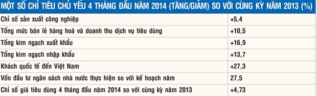 Chẳng hạn, theo báo cáo của Bộ Kế hoạch và Đầu tư tại phiên họp thường kỳ Chính phủ tháng 4, diễn ra ngày hôm qua (29/4) tại Hà Nội, lạm phát đang ở mức rất thấp, chỉ 0,88%; xuất khẩu vẫn tăng trưởng 16,9% so với cùng kỳ năm trước, ước đạt 45,74 tỷ USD; giải ngân cả vốn ODA và FDI đều đạt khá, với tương ứng là 510 triệu USD và 4 tỷ USD. Ngoài ra, theo ông Bùi Hà, Vụ trưởng Vụ Tổng hợp kinh tế quốc dân (Bộ Kế hoạch và Đầu tư), chỉ số sản xuất công nghiệp (IIP) 4 tháng tăng 5,4% so với cùng kỳ, cao hơn mức tăng 5% của cùng kỳ năm trước.