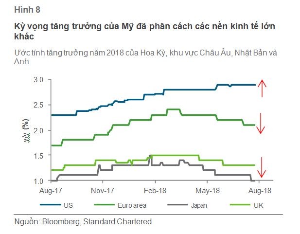 Theo Báo cáo, Mỹ đã dẫn đầu cách xa hơn các nền kinh tế phát triển khác về kỳ vọng tăng trưởng do thị trường việc làm mạnh mẽ và tác động của việc cắt giảm thuế của năm ngoái, tiếp tục hỗ trợ tiêu dùng. Nhu cầu gia tăng đang khuyến khích các doanh nghiệp chi tiêu vốn trở lại.