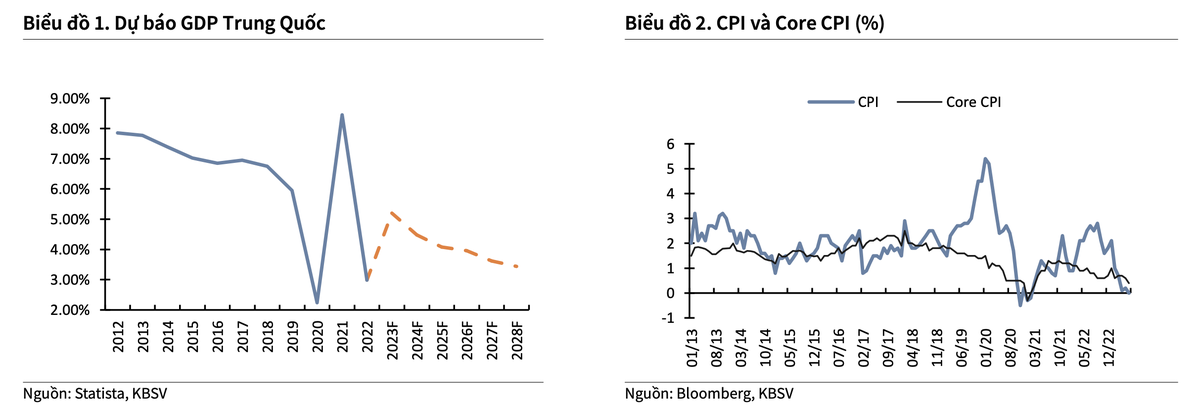 Trong báo cáo mới công bố, Công ty Chứng khoán KB Việt Nam (KBSV) cho biết, từ đầu năm 2023, Trung Quốc hoàn toàn gỡ bỏ chính sách Zero - Covid, mở cửa nền kinh tế trở lại. Rất nhiều chuyên gia kỳ vọng vào sự phục hồi mạnh mẽ từ nhu cầu tiêu dùng tăng mạnh sau 2 năm dịch bệnh. Tuy nhiên, GDP quý II/2023 nước này chỉ đạt 6,3%, thấp hơn kỳ vọng của thị trường là 7,3% và có dấu hiệu tăng trưởng chậm lại sau hơn 30 năm tăng trưởng thần tốc.