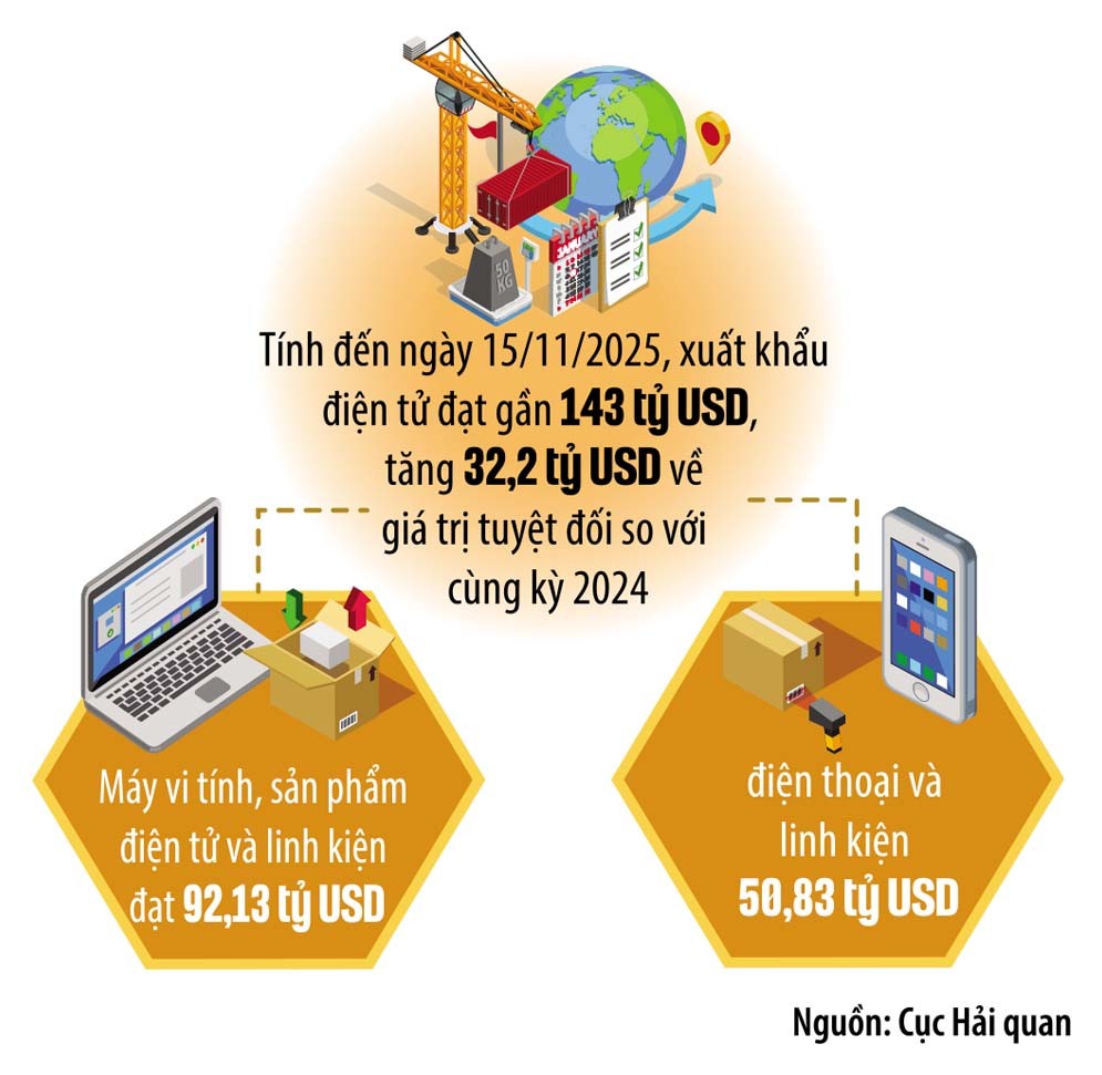 Thống kê sơ bộ của Cục Hải quan cho thấy, tính đến ngày 15/11/2025, tổng trị giá xuất khẩu toàn ngành điện tử đạt gần 143 tỷ USD, trong đó, máy vi tính, sản phẩm điện tử và linh kiện đạt 92,13 tỷ USD, tăng 48,3%, điện thoại và linh kiện 50,83 tỷ USD, tăng 5% so với cùng kỳ năm 2024.
