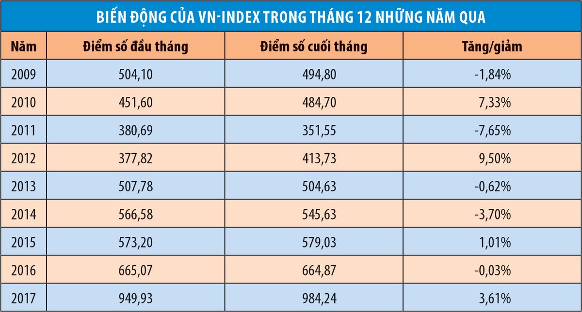 Cụ thể, thống kê biến động VN-Index trong tháng 12 từ năm 2009 tới nay, có 5/9 năm chỉ số kết thúc tháng giảm điểm. Nguyên nhân giao dịch kém tích cực giai đoạn này được cho là do dòng tiền có xu hướng nghỉ ngơi chờ đợi mùa báo cáo kết quả kinh doanh quý IV và cả năm.