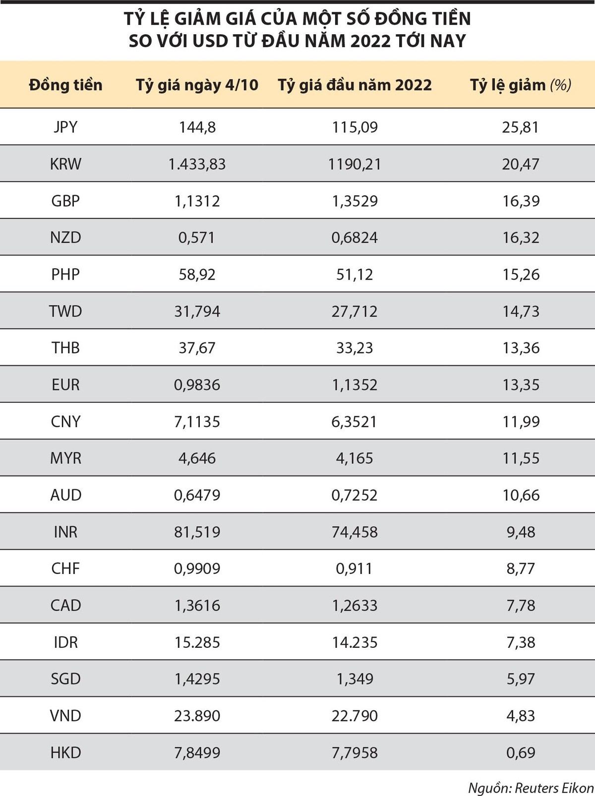 Diễn biến lạm phát cao trên thế giới và động thái tăng lãi suất của Cục Dự trữ Liên bang Mỹ (Fed) đã và đang gây áp lực lớn lên tâm lý nhà đầu tư toàn cầu, dòng vốn rút ra góp phần tạo áp lực mất giá đối với đồng tiền của các quốc gia mới nổi (trong đó có Việt Nam). Trong 9 tháng đầu năm 2022, một loạt đồng tiền mất giá mạnh so với USD (xem bảng).