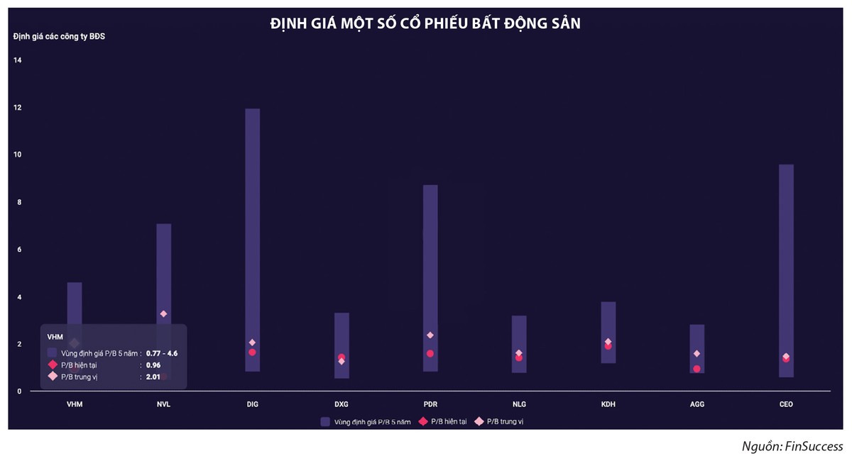 Bên cạnh xu hướng phục hồi, FinSuccess đánh giá, nhóm bất động sản đang được giao dịch tại vùng định giá khá hấp dẫn, P/B phổ biến ở dưới 1 lần. Đây là một trong những điểm hấp dẫn để nhà đầu tư tham khảo trong việc “xuống tiền”.