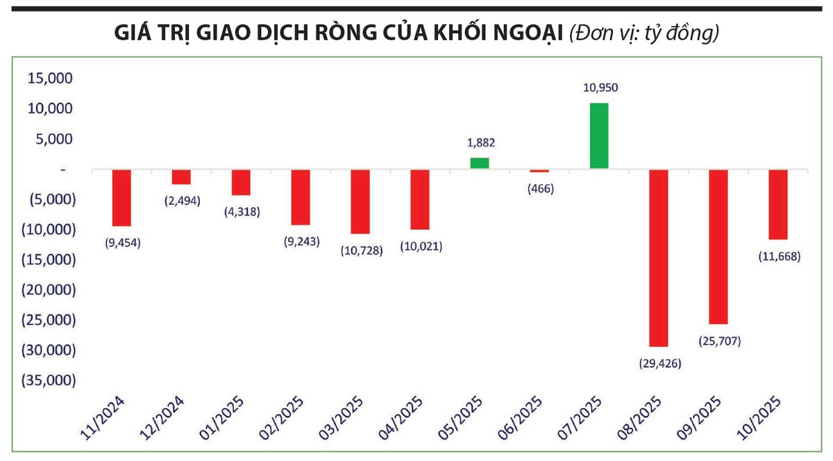 Thị trường chứng khoán đã trải qua đúng mẫu hình “tiền nâng hạng”, khi khối ngoại bán ròng mạnh để cơ cấu lại vị thế tại các quỹ theo dõi rổ Frontier (thị trường cận biên), trong bối cảnh thanh khoản chung suy giảm. Riêng tháng 9/2025, nhà đầu tư nước ngoài bán ròng xấp xỉ 1 tỷ USD trên cả ba sàn; giá trị giao dịch bình quân ngày cũng giảm khoảng 31% so với tháng 8, phản ánh tâm lý thận trọng và xu hướng “đứng ngoài” chờ sự kiện nâng hạng.