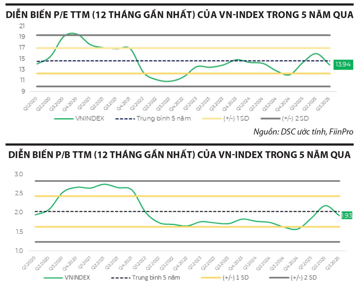Hiện tại, với mức tăng trưởng lợi nhuận toàn thị trường dự báo khoảng 15% trong 12 tháng tới, P/E dự phóng 12 tháng của VN-Index chỉ còn khoảng 11,85 lần - mức khá thấp so với trung bình 5 năm. Mặt bằng giá đang ở vùng hấp dẫn, mở ra cơ hội tích lũy cho nhà đầu tư dài hạn trong bối cảnh kỳ vọng lợi nhuận doanh nghiệp tiếp tục cải thiện.
