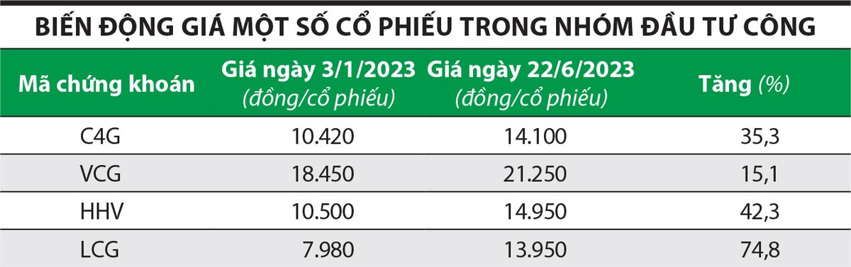 Trên sàn chứng khoán, nhóm cổ phiếu đầu tư công từ đầu năm 2023 đến nay thu hút nhà đầu tư, giúp giá và thanh khoản có diễn biến tăng.