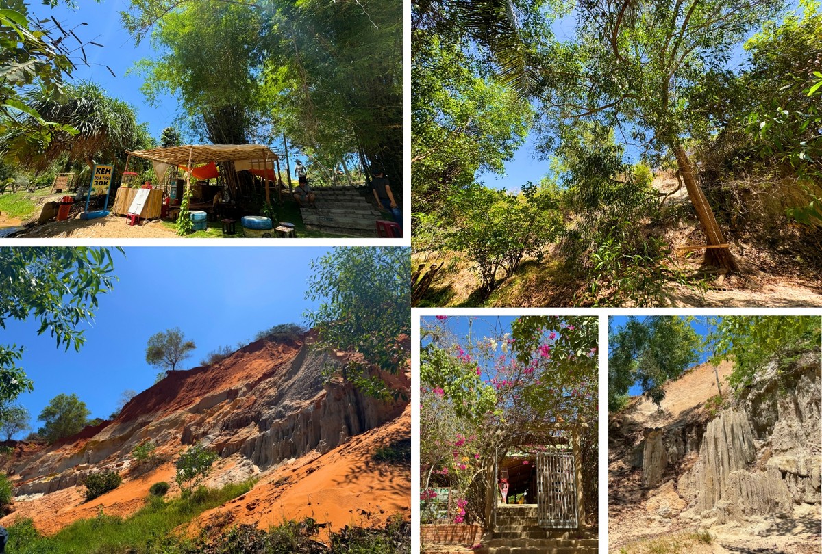 Đối diện với động cát đỏ tự nhiên có hai màu đỏ trắng là những bụi dứa dại um tùm xanh mướt, tạo nên một khung cảnh thật thơ mộng.