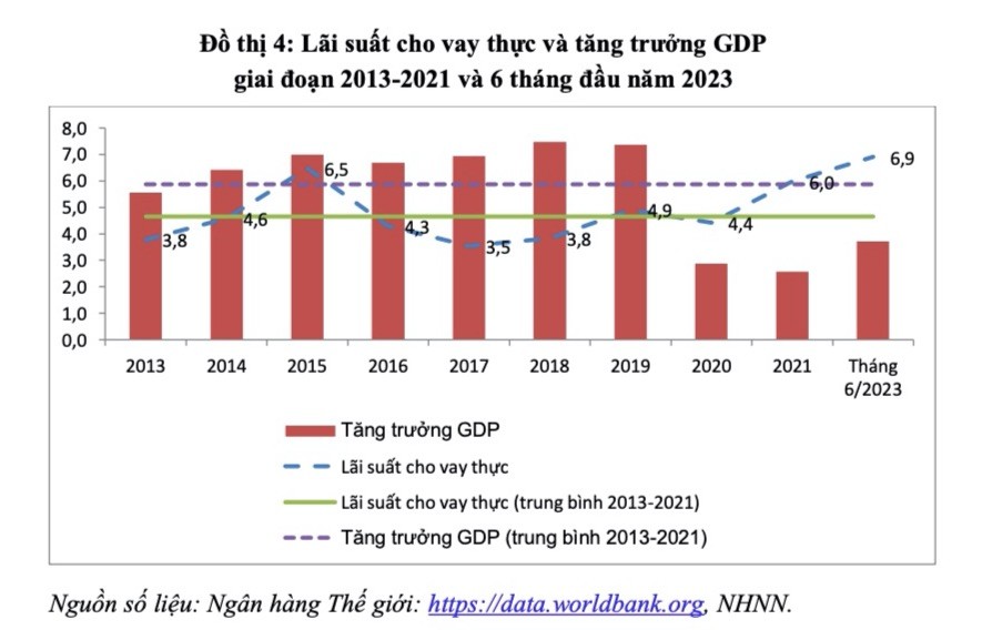 Thứ ba, lạm phát giảm mạnh là do lãi suất thực ở mức quá cao. Theo công bố của Ngân hàng Nhà nước, lãi suất cho vay bình quân đến giữa tháng 6/2023 là 8,9%. Với lạm phát so với cùng kỳ hiện nay đang ở mức 2%, mức lãi suất cho vay thực là 6,9%/năm, cao hơn tốc độ tăng trưởng GDP cũng như mức lãi suất thực trung bình của giai đoạn 2013-2021 là 5,9% và 4,6%. Đây là mức lãi suất cản trở phục hồi kinh tế và tăng trưởng, làm giảm tổng cầu đồng thời làm tăng nợ xấu.