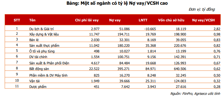 Nhìn chung, đối với nhóm vay nợ cao khả năng kết quả kinh doanh 2023 vẫn kém tích cực so với 2022, tác động tích cực đến lợi nhuận có thể từ năm 2024 trở đi. Một số nhóm ngành có tỷ lệ vay nợ cao nhà đầu tư nên theo dõi xác định đáy lợi nhuận để tiến hành giải ngân đầu tư như bảng thống kê ở trên.