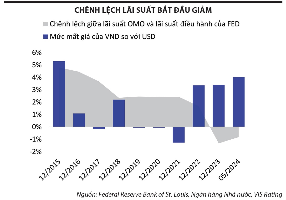 Cùng với đó, áp lực mất giá VND trong nửa cuối năm 2024 bắt đầu giảm dần. Trong giai đoạn đầu năm 2024, áp lực mất giá VND đến từ nguyên nhân chính là mức chênh lệch giữa mặt bằng lãi suất tiền đồng và lãi suất tại thị trường Mỹ, đại diện là Cục Dự trữ Liên bang Mỹ (Fed), chuyển từ mức trên 2% sang mức âm kể từ giai đoạn cuối năm 2023. Điều này dẫn tới yếu tố tâm lý thị trường gia tăng vị thế nắm giữ USD nhiều hơn và gây áp lực tới cung - cầu USD trên thị trường trong nước tại một số thời điểm.
