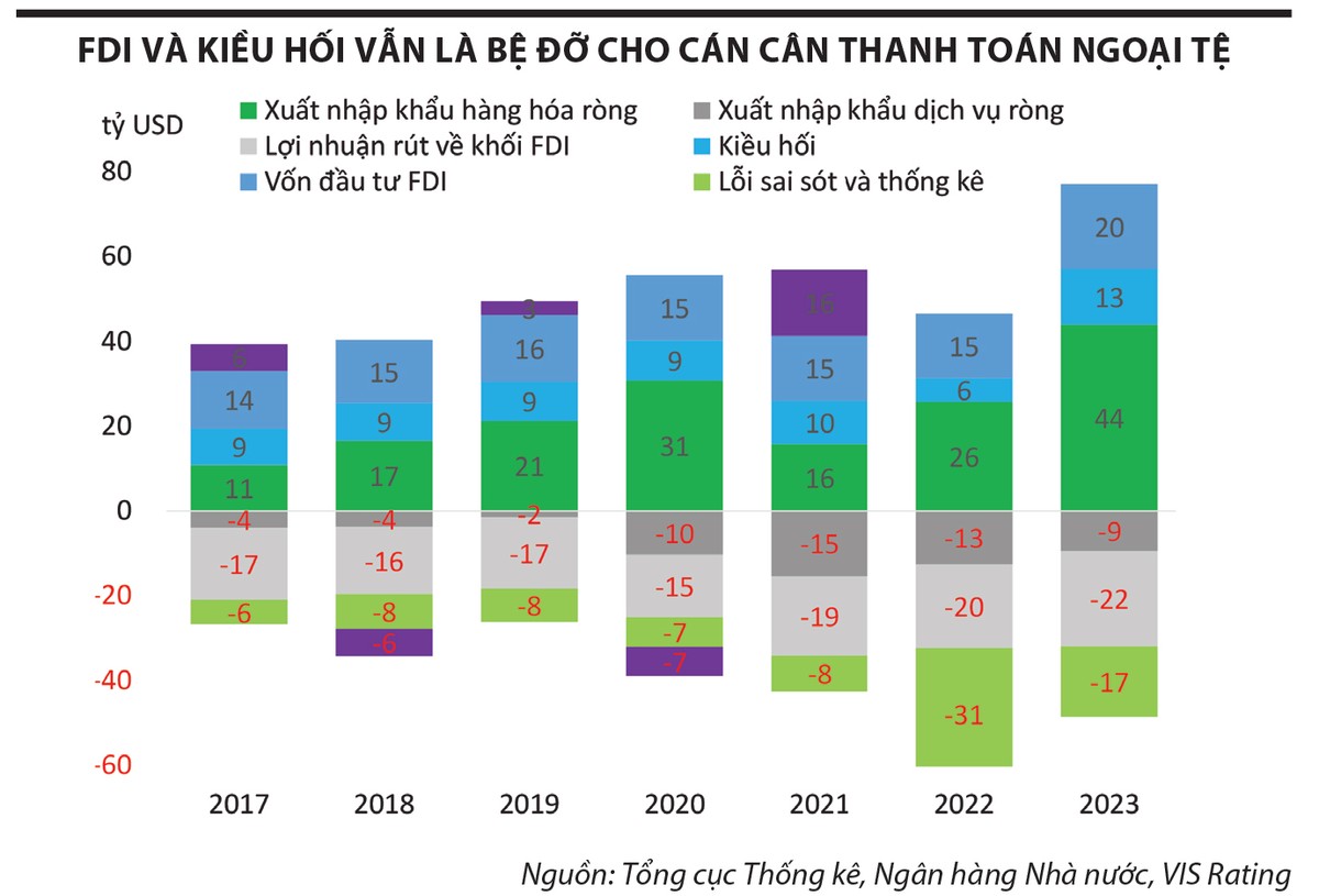 Về cung cầu ngoại tệ trên thị trường, các nguồn ngoại tệ chảy vào Việt Nam trong năm 2024 vẫn được kỳ vọng sẽ duy trì ổn định, đặc biệt là ở phần vốn đầu tư nước ngoài (FDI) và kiều hối gửi về Việt Nam. Trong năm 2023, nền kinh tế Việt Nam có mức xuất siêu hàng hóa rất cao (44 tỷ USD) chủ yếu do phía nhập khẩu hàng hóa nguyên liệu đầu vào cho hoạt động sản xuất giảm mạnh. Năm 2024, mức xuất siêu hàng hóa sẽ giảm đi, tuy nhiên về tổng thể nền kinh tế Việt Nam vẫn tiếp tục duy trì trạng thái xuất siêu với sự đóng góp chủ yếu của khối FDI.