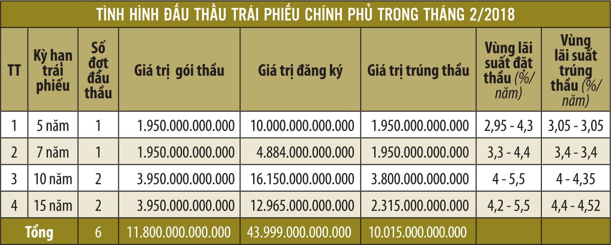 So với tháng 1/2018, lãi suất trúng thầu của trái phiếu Kho bạc Nhà nước giảm trên tất cả các kỳ hạn. Theo đó, kỳ hạn 5 năm giảm 1,25%/năm, 7 năm giảm 0,95%/năm, 10 năm giảm 0,38%/năm, 15 năm giảm 0,1%/năm.