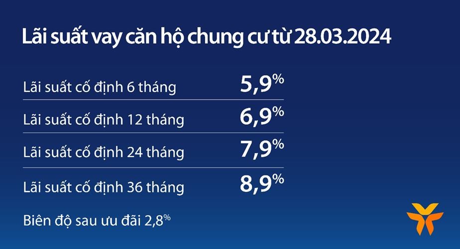 Như tại VIB, ngân hàng này đang cho vay mua chung cư thế chấp bằng căn hộ có sổ hồng với nhiều lựa chọn về lãi suất, theo nhu cầu của từng khách hàng. Chẳng hạn, khách hàng có 4 lựa chọn lãi suất cố định từ 5,9%, 6,9%, 7,9%, 8,9%/năm tương ứng với các kỳ hạn 6 tháng, 12 tháng, 24 và 36 tháng. Sau ưu đãi, biên độ dao động chỉ ở mức 2,8% giúp khách hàng có thể dễ dàng hơn trong việc hoạch định tài chính và dòng tiền bởi ít chịu ảnh hưởng của tình hình lãi suất.