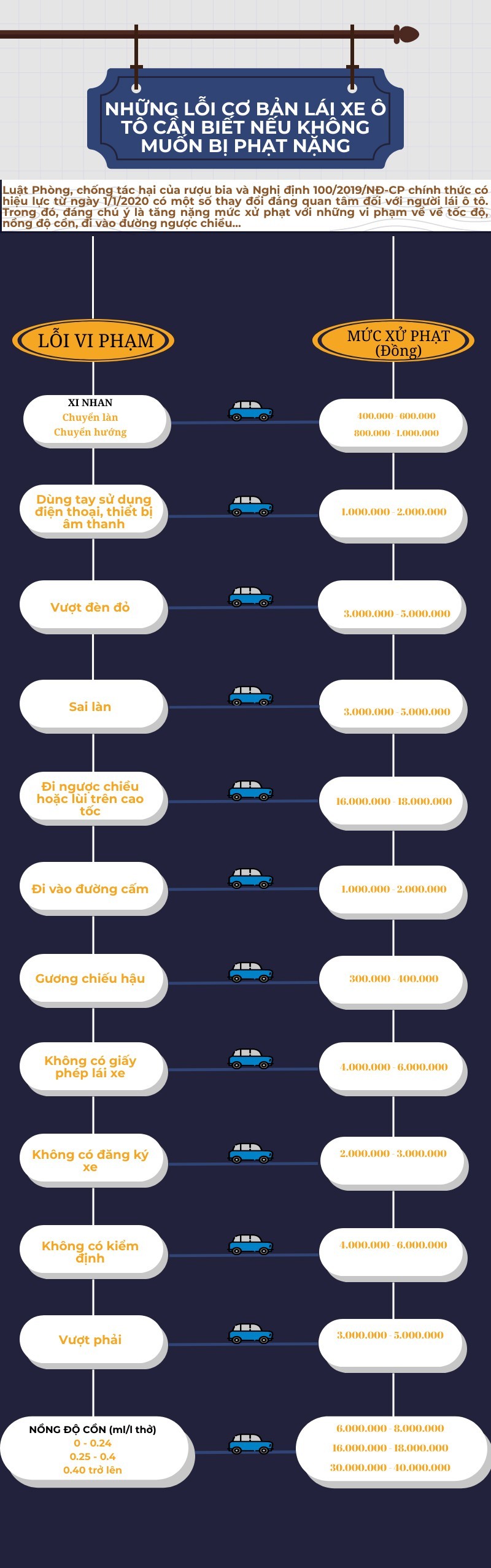 Theo VOV Tin liên quan Mức phạt với người uống rượu, bia điều khiển xe tham gia giao thông 02/01/2020 06:47 Nhiều điểm mới trong đào tạo giấy phép lái xe 24/10/2019 07:28 Vi phạm của tài xế sẽ được cập nhật trên mạng từ 1/6 26/03/2019 09:11 Hàng loạt vi phạm trong đào tạo lái xe 14/06/2018 09:45 Từ khóa Nghị định 100 lái xe ô tô