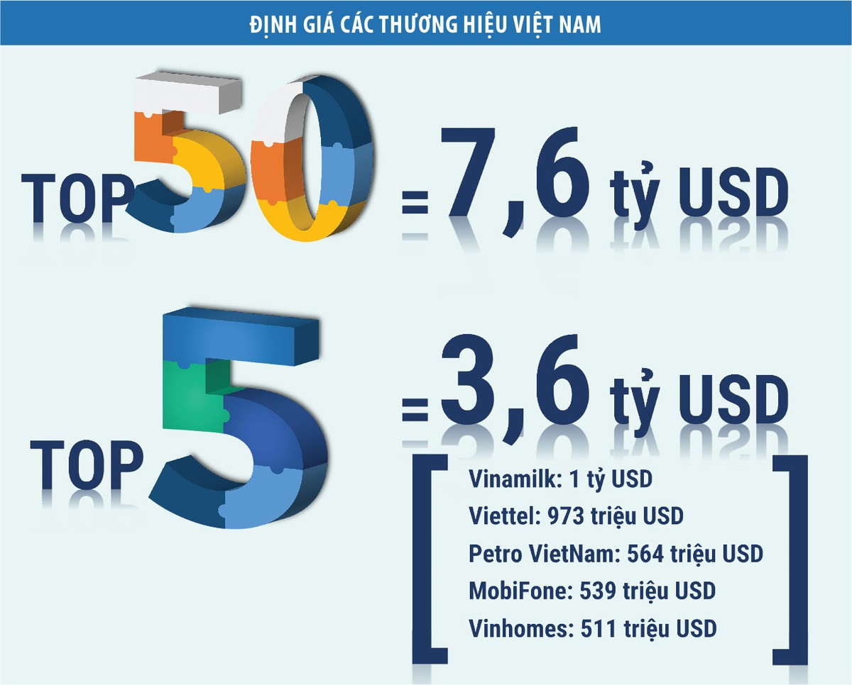 Top 5 thương hiệu hàng đầu Việt Nam gồm Vinamilk, Viettel, Petro, MobiFone và Vinhomes cũng chỉ được định giá 3,6 tỷ USD. Theo ông Toàn, giá trị thương hiệu được định giá với con số khiêm tốn nêu trên, bởi nhiều doanh nghiệp Việt chưa thực sự chú trọng đến việc xác lập thương hiệu và vì thế, thế giới chưa có đánh giá đúng về giá trị của thương hiệu Việt.